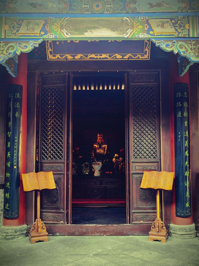殿内主祀王灵官——道教护法神,三目怒视、金鞭高举,体现“纠察三界”的威严;左配马王爷(司火之神),右奉月老,形成“刚柔并济”的神系组合。建筑采用抬梁式结构,朱红槅扇门嵌八卦纹,斗拱承托歇山顶,檐角悬惊鸟铃,风中清响如诵道经。