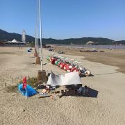从景区大门进来,走过了最大的红色船“中国渔村号”三桅帆船,然后就可以看到海看到沙滩了,一排迎风飘扬的旗帜首先映入眼帘,沙滩上排满了人,但不是很拥挤,尽管在五一。