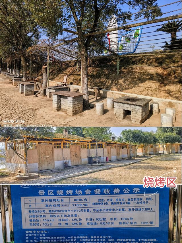 ①烧烤区:1排露天炉灶式烧烤摊外加1排烧烤小屋。