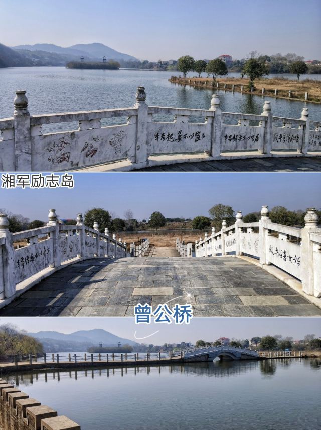 ⑤曾公桥:连通东岸和湘军励志岛的单拱石桥,桥栏上有题刻,估计也是湘军历史人物的手迹。