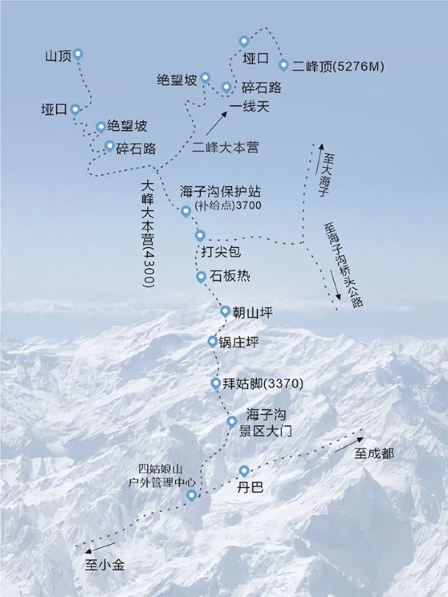 四姑娘山大峰二峰均需要抵达阿坝小金县四姑娘山后,然后从景区出发,前往大二峰大本营后冲顶后在沿路返回镇上回到成都。