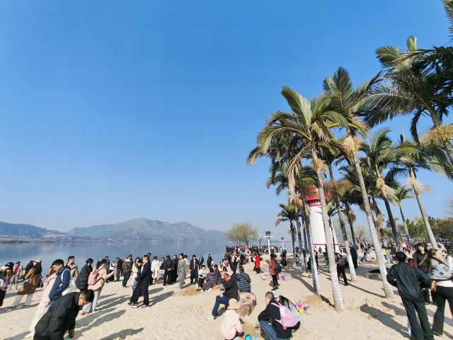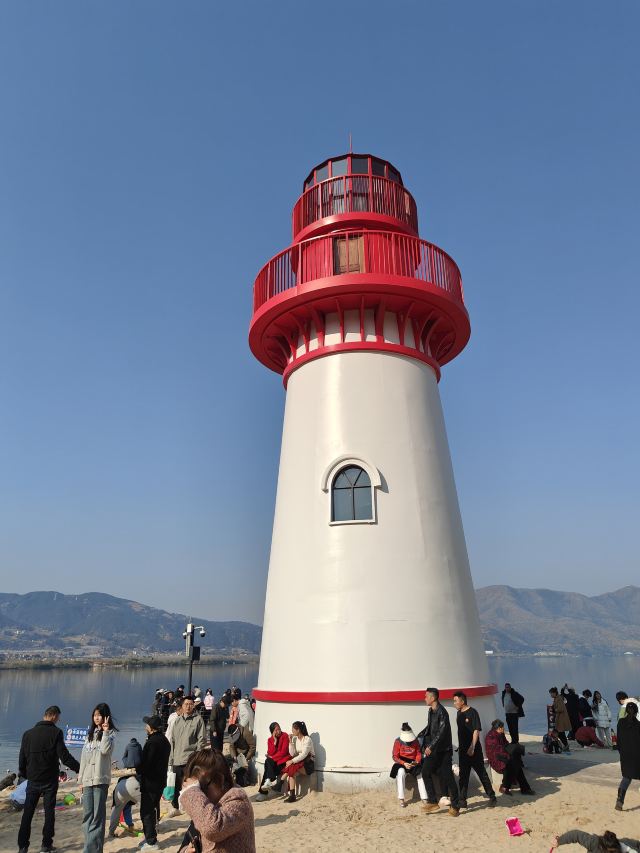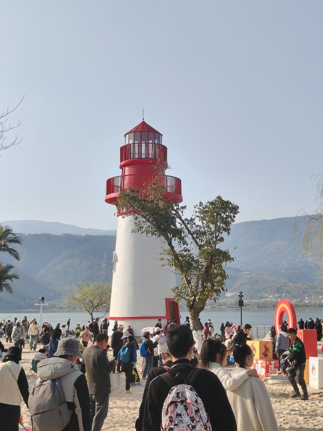 4分 满意这就是邛海边的一处小景点,有停车场,很适合溜娃,其实就是一个普通的人造沙滩,游客很多,本地人也不少,主要还是小孩很多,这里的沙挺干净的,沙的细腻程度还是不错的,小孩能在这里耍三天。其他就是这里适合没有去三亚的美女拍照,一拍就是一天,灯塔,椰子树,沙滩,海边拍照的标配。这里有个很大的停车场,建议提前点来,不然都堵在路口了,这里上午来耍沙很多,下午来等着看夕阳的也很多。