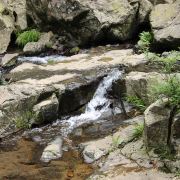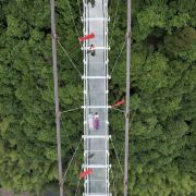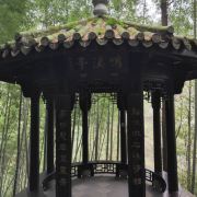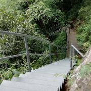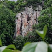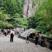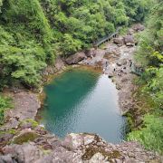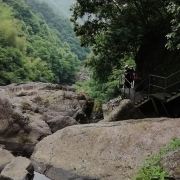 从山脚爬到山顶至少需要半小时,沿着步道继续往前走,便可回到山下的溪边,走到尽头处是“第九洞天”大穿越的服务区,这里离赤水桥也不远了。第九洞天是景区新近推出的一些户外拓展项目,滑索、山间独木桥之类。