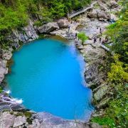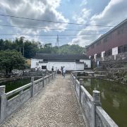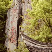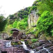 如果要去爬山,可进入景区大门后直接往左,走不远便是赤水桥,过桥即是山门入口,有石碑刻着“丹山赤水”四字,可拍照留念。你也可以从村中的牛头山路出发,过樵苏园,走九曲鸿运道至溪边,这里是夏天漂流的起点,可乘皮筏一路漂到下游的次入口。往左则是通往山上的步道,步道缠绕在溪水两侧,有小桥相连。