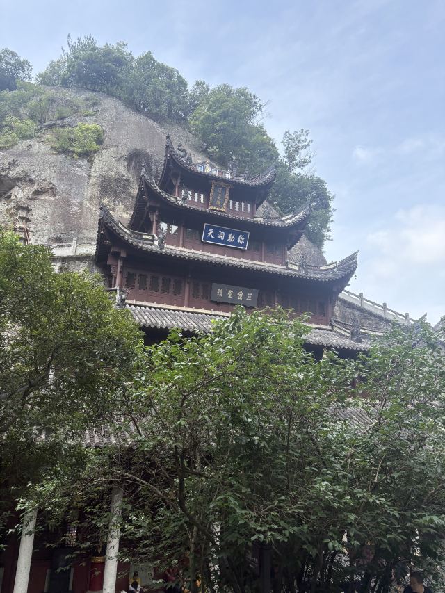 令人惊叹的是,它外面五层的木结构建筑和里面的石窟完美融合在一起,里面供奉着一尊高达16米的石弥勒像。塑像开凿于南朝,金碧辉煌,是江南早期石窟大佛,被誉为“江南第一大佛”,比四川的乐山大佛还早200年。大佛殿一旁的放生池边,有始建于隋朝的智者大师纪念塔。