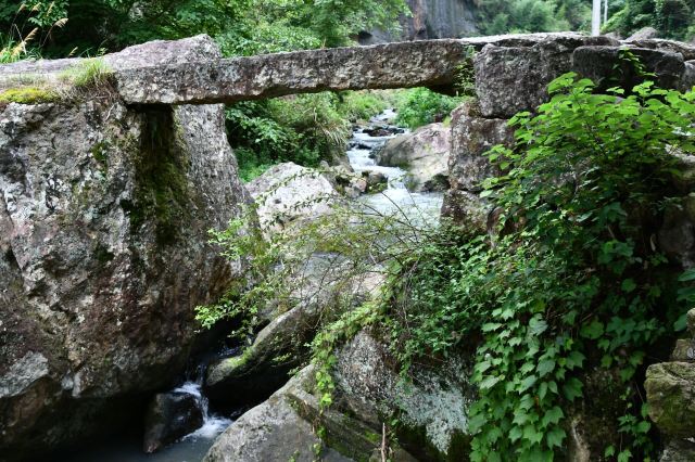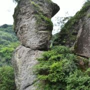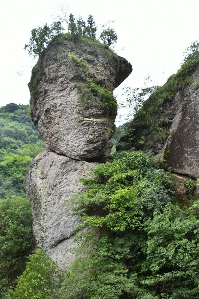 一个深长的峡谷之中,竟有一座蘑菇云般的巨峰冲天而起,远远望去,活脱脱地似一只倒置的长统靴,靴底朝天,人称“倒脱靴”。不过,那靴子大得很,高达11米,宽有3米。循北侧岩隙疏木可攀登至靴底,观靴之石,均为颗粒形砂石,风化而聚,近视唯恐坠落,但用手挖之,恰似铜铸铁浇般坚实,纹丝不动。抬头仰望靴之顶,有枫松、古柏,形姿奇特,郁郁葱葱,不论天寒地冻,风吹雨打,那树岿然屹立!“倒脱靴”景点以它特有的魅力,吸引着无数的观光者。但大的享受,莫过于坐在“倒脱靴”边的岩石上小憩,仰望茂林秀竹,俯看碧潭清泉,听那过路歇脚的砍柴老伯讲那美丽的传说。