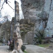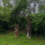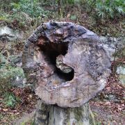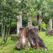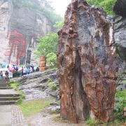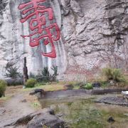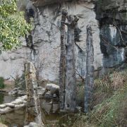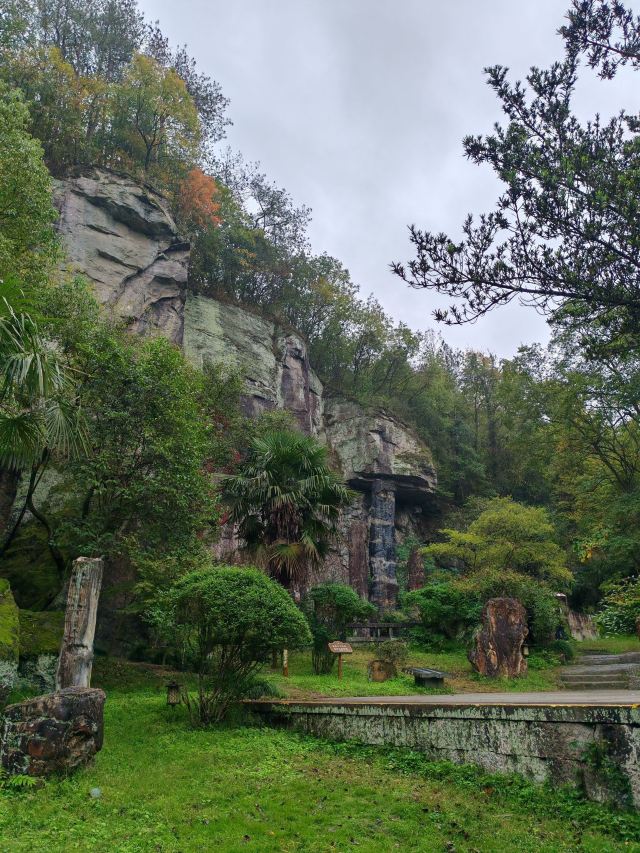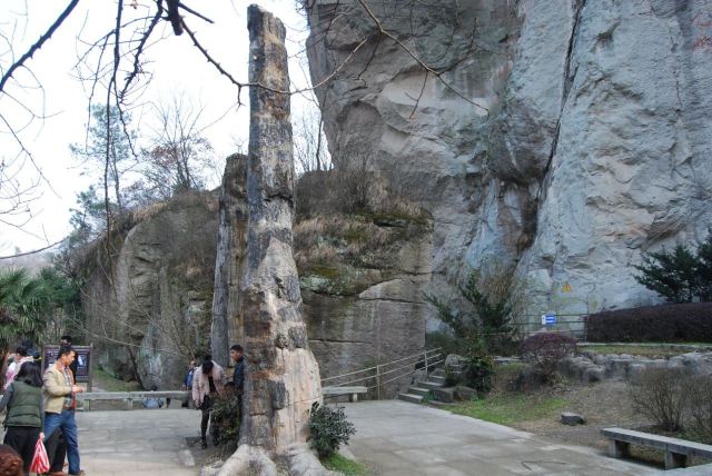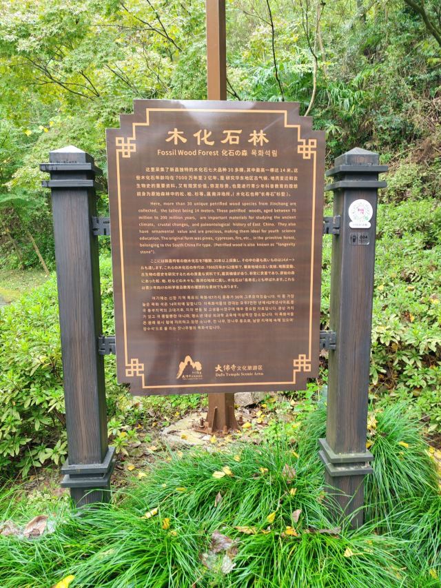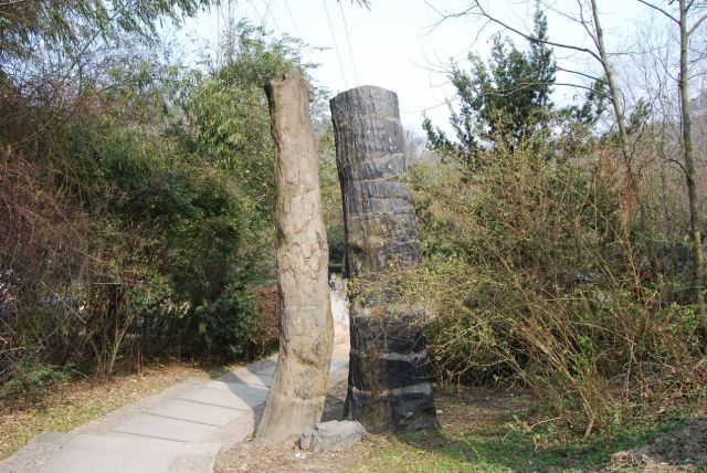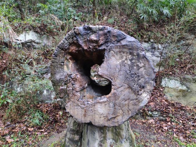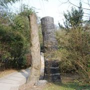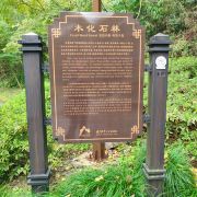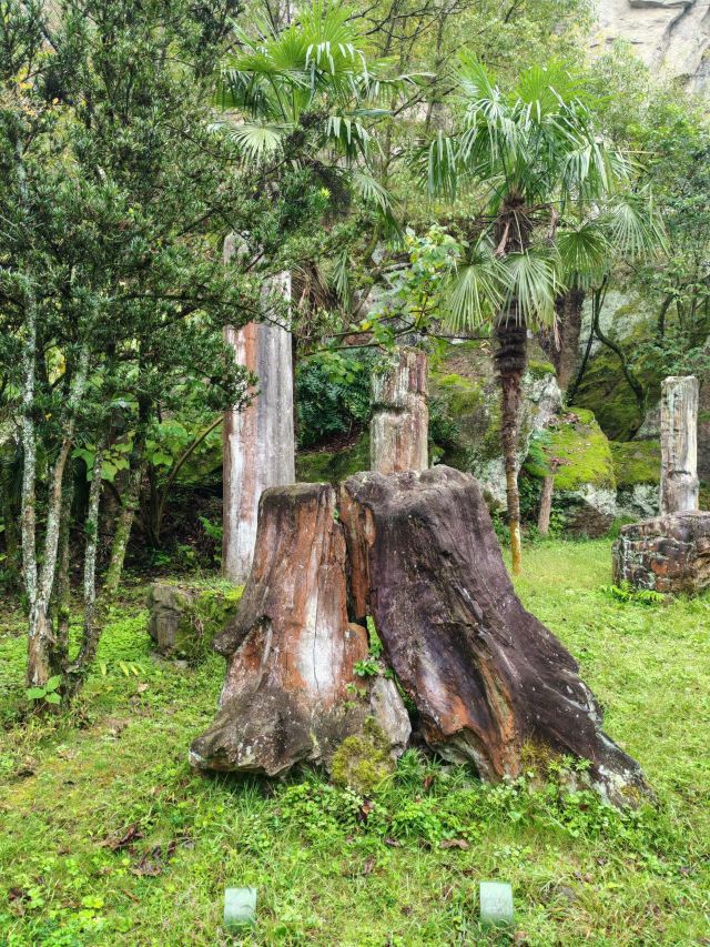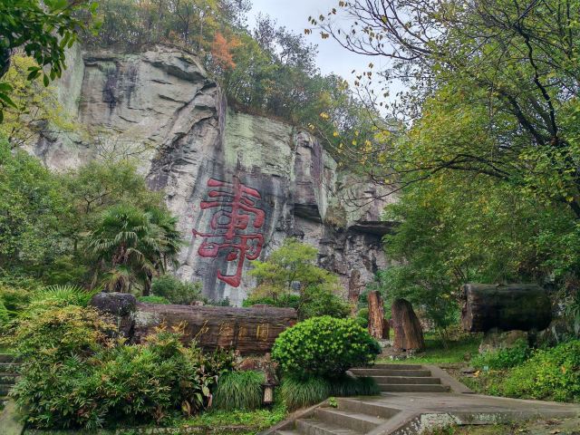 新昌的木化石林,建于1999年3月,这里集中了新昌独特的木化石50来棵。木化石的年龄有亿年以上,故又称“长寿石”,石壁上有一个“寿”字,高15米,宽11米,系著名书法家沈鹏手笔。