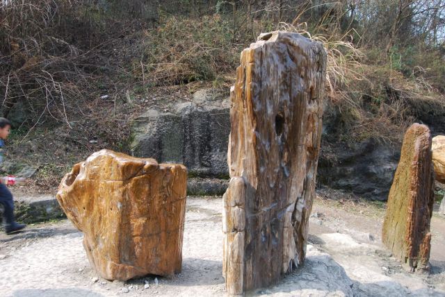 它们有的亭亭玉立,有的粗犷雄壮;有的黑如煤炭,有的色如黄蜡;有的树皮和蛀虫疤痕犹在,有的已被人工打磨得如玉似珍;有的被雷击、火烧以后埋入地下变成化石,有的受水流冲击,至今还有沙石镶嵌在树缝,石子和大树经历了相似的命运以后,现在已融合在一起…;…;各式各样,种类繁多。