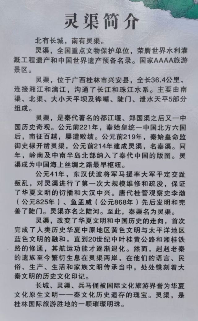 步入景区后,可以先去展览厅去听一听对灵渠历史和工程构造的讲解。这能更好的帮助你了解灵渠,越是了解越是能感慨这项工程的伟大。
