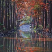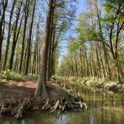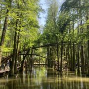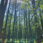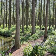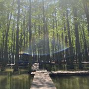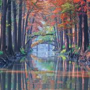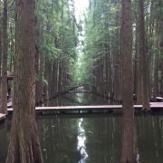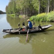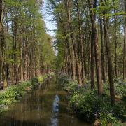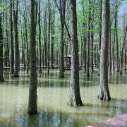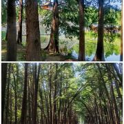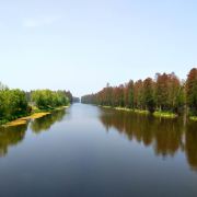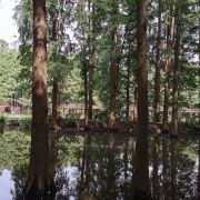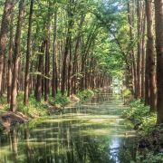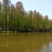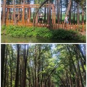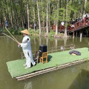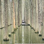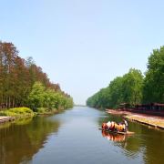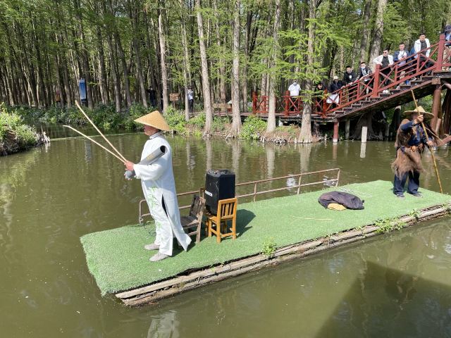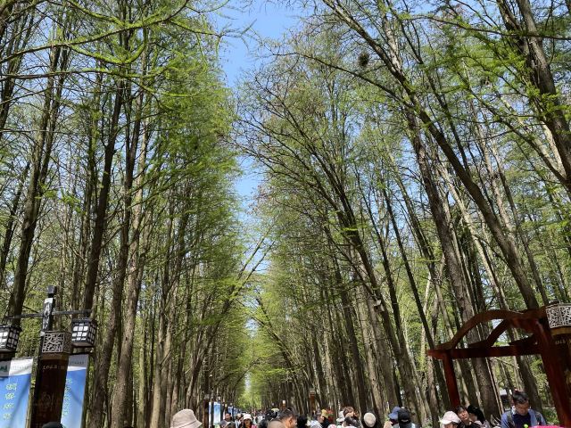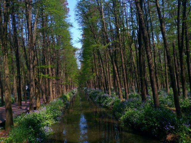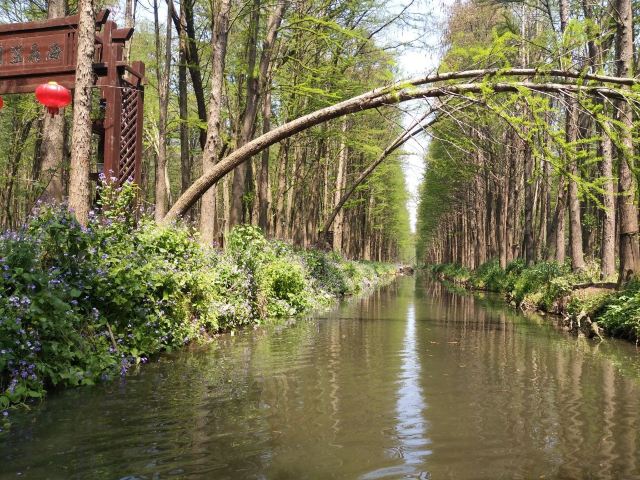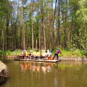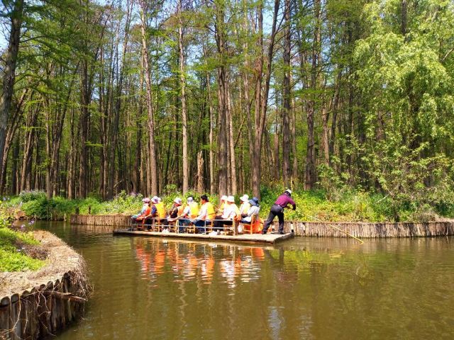 进入李中水上森林公园,左侧便有一个渡口,可以由此乘坐木筏。缓缓漂流在河道间,看两旁大片的池杉、水杉扎根于水中,屹立而起、高耸入云,俨然一片绿色水上森林。林中鸟类品种繁多,有猫头鹰、野鸭、白鹭、黑杜鹃、草鹦鹉、喜鹊等,树梢上的鸟巢随处可见。林中鸟平时有3万多只,最多时有6万多只。也许在不经意间便会惊起林间水滩上栖息的水鸟,展翅飞起的鸟儿引得许多摄影爱好者举起相机抓拍。