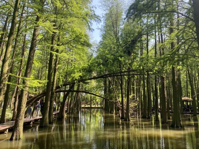 微信小程序李中水上森林公园是人工生态林。公园原为荒滩,上世纪80年代初,当地干部群众为合理开发利用荒滩资源,将这里的荒滩开发成一条条垛格,栽种适应水中生长的池杉、水杉等树木品种,林中间种艿芋、油菜等经济作物。如今栽种的10万余株水杉、池杉等品种树木已长成高大茂密、生机盎然的水上园林,这个天然大氧吧是都市人回归自然的好去处。