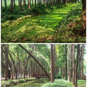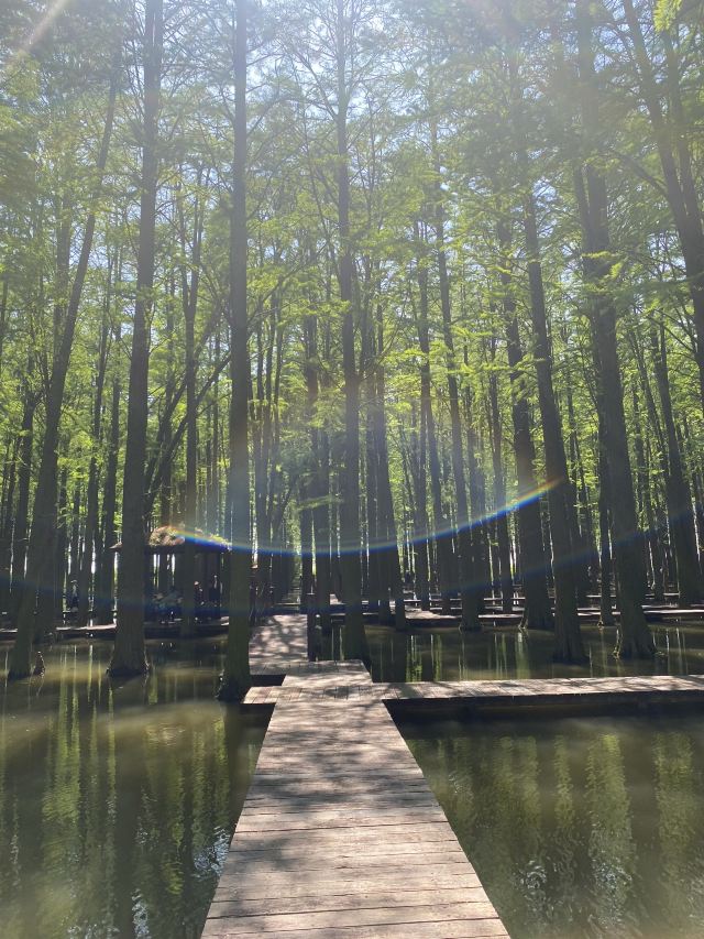“林中有水、水中有鱼、林内有鸟”是李中水上森林公园的公园的特色。跟着公园内导游牌的指示,游走在小九寨沟、板桥栈道、难得糊涂林、步云桥、林中水巷等景点间,阳光透过树叶一丝一丝洒落,林间阵阵清风吹过,不时传来鸟儿婉转的鸣唱。林中还有水上小木桩,可以行走其上,体验水上漂的感觉。在雾森幻境中,将净化后的地下水通过高科技装置进行雾化,将3500平方米的森林营造出烟雾缭绕的意境,夏天来此避暑再适合不过了。