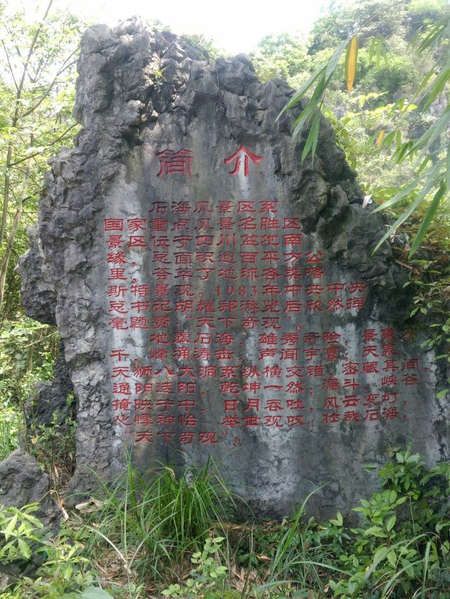5分 超棒中午到的石海景区。先吐槽一下,有一段10几公里的50码限速路,摩托车在我的GL8旁呼啸而过,绝望。120元套票,80门票,40交通工具票,老人免票的。花了120元请了导游刘米钗,整个下午陪着我们一家老小,讲解精彩,十分感谢你对我们两位腿脚不便老人的照顾,有你的陪伴,我们全程都很开心。因景区在施工,我们先去了夫妻峰、一线天、生命之源,巧夺天工。再看了悬棺,感受当地历史文化。再去了大漏斗,体会大自然的奇妙。游天泉洞,这是我见过的最大的一个洞了,洞内凉爽,五光十色,好美丽,乘游船出洞。最后,去了石海,规模不大,但也算自然的鬼斧神工。全家人都乐不思沪。结束旅程,还要赶往竹海,又想起了那段50码限速路,有点晕。