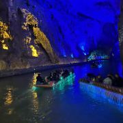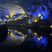 天泉洞内可乘船游览地下暗河,灯光营造的奇幻氛围适合亲子游玩,但溶洞湿滑需注意安全。