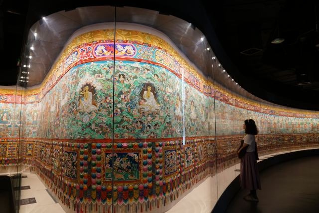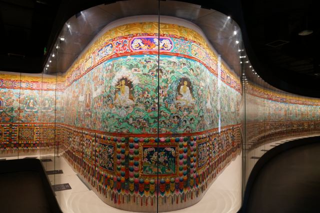 博物院的建筑极具特色,融合了现代建筑理念与传统藏式建筑风格。其外观宏伟壮观,巨大的石块垒砌而成的墙体给人一种古朴而厚重的感觉,就像古老的藏式城堡。屋顶上那标志性的金顶在阳光下熠熠生辉,彰显着藏传佛教的神圣与庄严。