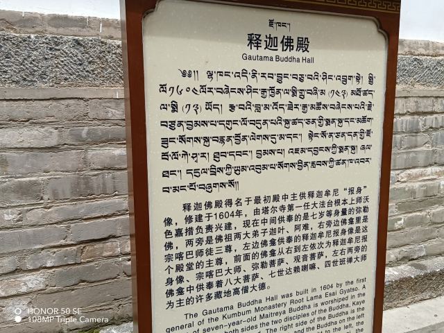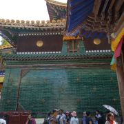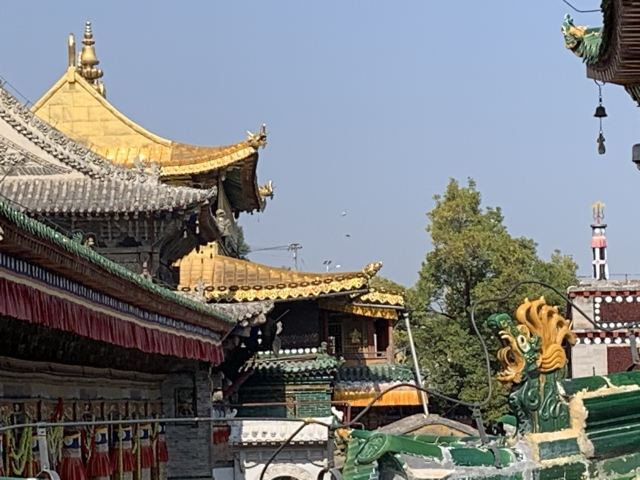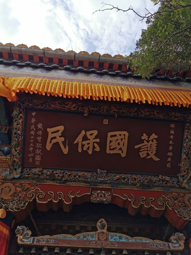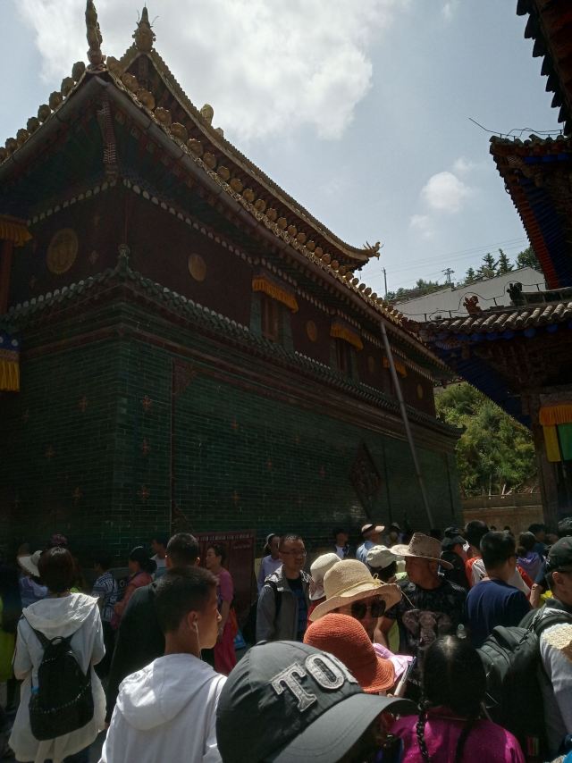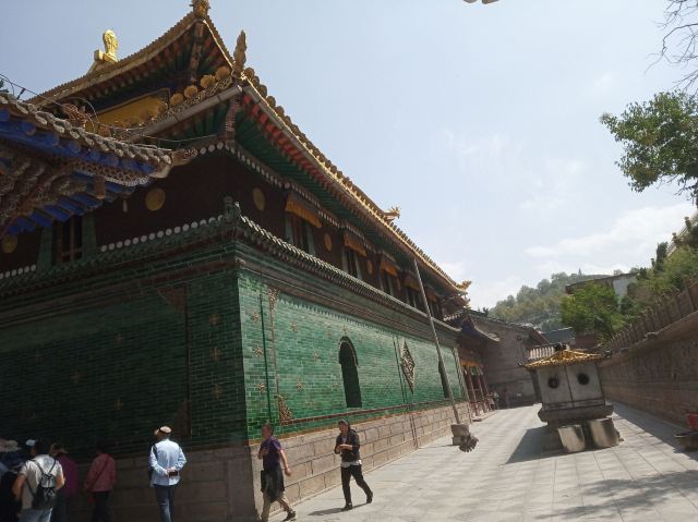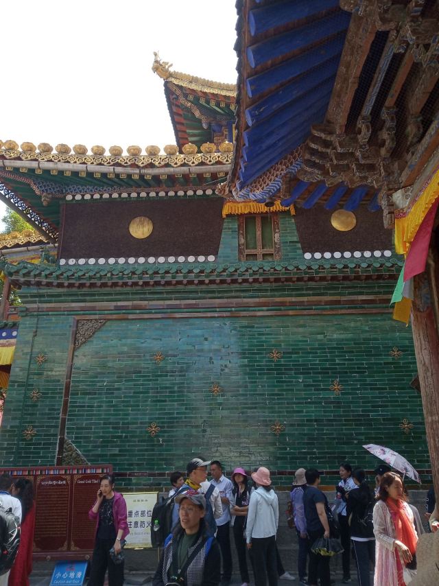 首先浙个大金瓦殿真的是非常的气派,金顶琉璃墙,统统都是贵重的物品,据说是清政府特供过来的,反正价格特别厉害,殿内据说就是藏传佛教宗喀巴大师的出生地,脐带血长成一颗菩提树,然后在其上建了佛像,盖了这座大金瓦殿。殿门外还有一颗菩提树,树叶据说现在都用来作为法物了。