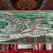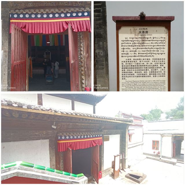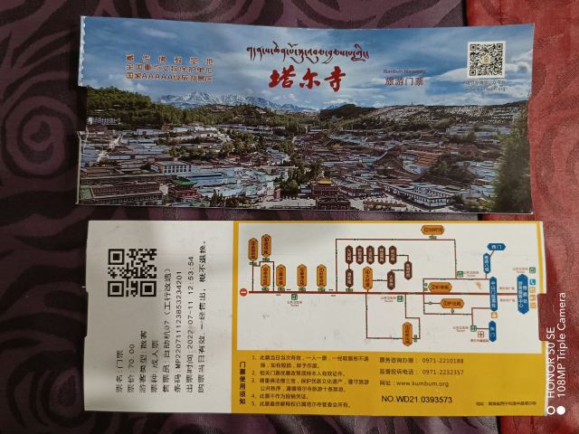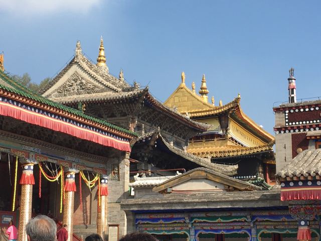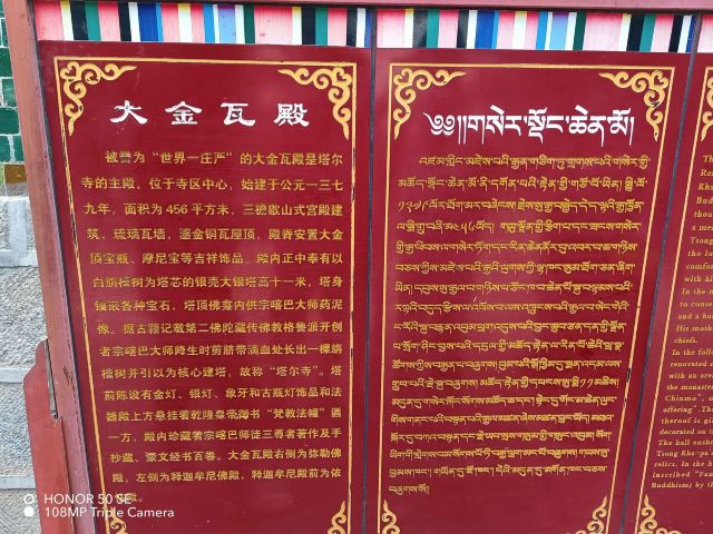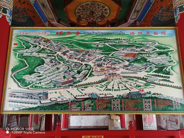2、从东山门入园向南走,途径“护法殿”、“印经院”(不让进,里面是用古老传统的活字印刷术印经)和“敬老院”(退休后僧人的住所,塔尔寺周围高处的建筑是僧人宿舍)后到“大金瓦寺”。进寺后首先进“大经堂”,168根柱子支撑的大堂极其宽敞,能容纳2000名僧人修行,每两排僧人面对面,头顶悬挂“塔尔寺三绝”之一的堆绣(3D版的立体刺绣)帘帐,炫丽的色彩、细腻的图案已保存了几百年。这里是僧人集团诵经的场所,四周墙壁的经架上存放了数百计的经书。大经堂始建于明朝,100年前焚毁后又重建。出堂的右手边是“茶房”是寺里的厨房,里面三口硕大的锅用来制作糌粑(藏民特有主食,青稞加酥油捏合而成,热量很高很管饱),每口锅大得据说能同时煮好几头牦牛。之后途径左手边的“依怙殿”(建于明朝,供奉宗喀巴大师镀金像,宗喀巴最初师从红教,不满于宗教系统日益腐败便创立教律严格的黄教,他把自己原来红教的红色帽子直接反过来戴,所以黄帽子上能看到红边)和“释迦牟尼殿”(建于明朝,里面原本主供释迦牟尼,但一场大火唯独把释迦牟尼像烧毁,其他副位的佛像都完好)后到达塔尔寺主殿大金瓦殿。大金瓦殿建于1379年,里面供奉的是以宗喀巴大师降生后的脐带血落地处长出的菩提树为塔芯的大银塔,耗用黄金1300两、白银一万多两,镶嵌宝石无数,佛龛里有迦叶佛佛牙和如来佛佛骨舍利。大银塔建成后才以塔为中心逐渐扩建成现今的塔尔寺,先有塔后有寺,这点不同于其他寺庙。讲解员说银塔内的菩提树并未死亡,因为它的根延伸到殿外又长出一棵新菩提树。大金瓦殿门框上方悬挂有乾隆皇帝亲笔题写的《梵教法幢》匾额,最里面有塔尔寺三绝之一的酥油花,即用酥油捏成的花,熔点极低,巧匠捏花时手指要不断沾水降温,长期捏花的手指会残疾,是国家非物质文化遗产。殿外的殿前大院,四周有碑廊、转经轮、活佛坐席和很多佛教信徒磕长头,他们一生要磕足10万个头,手腕上戴着计数器,这里的僧人终身不能结婚,但可以吃肉。