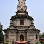 华塔平面为八角形,由主塔和四小塔组成。主塔立于八角形台基上,四角为扁六边形的单层小塔。主塔第四层是华塔壁塑部分,也是华塔精华之处,通体彩塑力士、兽首、狮、象、佛、菩萨等艺术造型,错落有序,雕饰精美,甚为华丽,恰似一处五彩缤纷的小型雕塑艺术之宫,在中国古建筑史上占有重要的地位。清乾隆帝曾二次登临华塔拈香作诗,题写匾额,著名古建大师梁思成称其为“海内孤例。华塔在宋、金、明、清均进行过不同的程度的修葺。