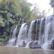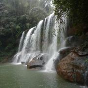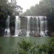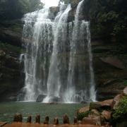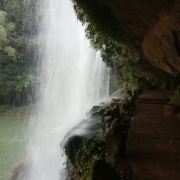 5分 超棒最后我们游览四洞沟。四洞沟原名闽溪,因溪中四级瀑布,瀑后有穴洞,后俗称为四洞沟。离赤水城17公里,在景区均分布的4幅情神各异的瀑布,形成一个仪态万千的瀑布群落,被誉为:“万竹之园,小家碧玉,没有败笔的景区”。我们沿着沟谷去寻找4种不同情神的瀑布,河谷两旁万竹拥溪、山涧流泉,我们来到第一个瀑布,上游有一巨石形如巨象,两侧银瀑高挂,巨石卧于瀑下,可瀑下巨石上写着“飞蛙崖”,我怎么看也想象不出青蛙的样子。可能每个人从不同的角度看待不同的事物都会有不同的观点,我们还要继续寻找。这时远看前方出现秀美得宛如一把向下弯形的银梳,飞珠展玉,银光闪烁,这就是月亮潭瀑布。再往上走,看到脚下的石涧,原来月亮瀑是从这儿流下的。崎岖山路,蜿蜒而上,眼前展现一幅壮观的飞瀑景观,一涧瀑布如银帘悬挂,白纱绢绢,声若雷鸣,气势万钧。瀑布水帘后是一贯穿瀑布两端,三面为石,一面为水的洞穴,一条石板小径随洞穴曲折蜿蜒,游人必须低头弯腰才能通过。一路上幽深曲径,穿涧而行,近2个小时了,也不感觉累,要去看看最后一个瀑布--白龙潭瀑布。四洞沟瀑布群中最大的一个瀑布,瀑布高60米、宽23米,瀑声如雷,雨雾弥漫,飞流直下,气势恢弘,动人心魄。瀑下“白龙潭”龙翻水沸,飞珠溅玉,银光闪烁。站瀑下,云烟笼罩,雾气腾腾。找到了四个瀑布返程,就匆匆往回走,开始走马观花。走着走着,忽然前面溪中一只青蛙蹲于滩前,低头俯视,向下张望,妙趣横生,两侧水流极速倾泻。待我走到水底慢慢看来,原来这就是飞蛙瀑布。这时才心领神会,不得不佩服大自然的鬼斧神工!