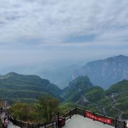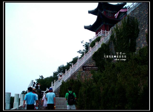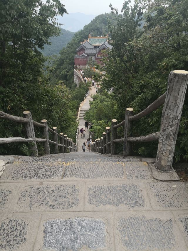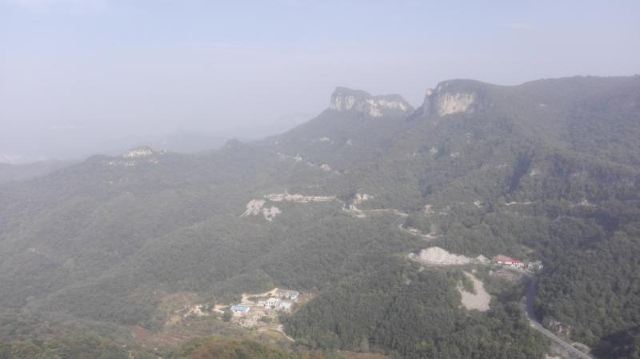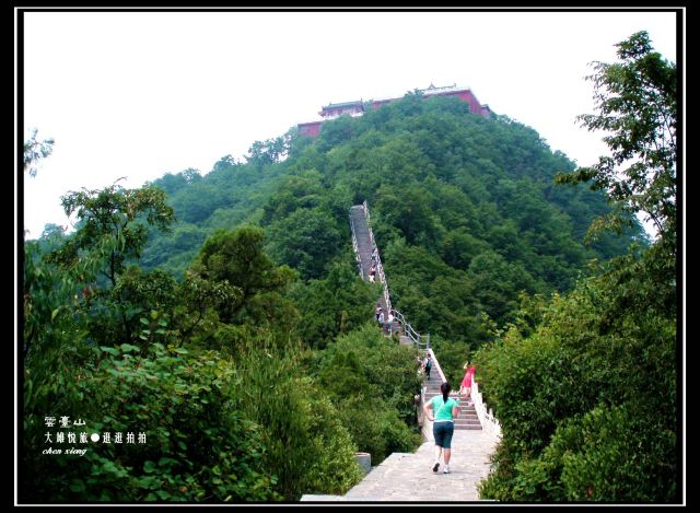可是第二天截然相反,只游茱萸峰一个景点,却累成狗,还索然无味。小导游安排不当,先送我们坐索道上凤凰岭,20元的玻璃栈道很短,景色一般,新修的一亭一观也没特色,然后就是走山路,两边都是密密的树林,啥景都没有,上坡下坡,下了又上,上了又下,没完没了,好不容易来到茱萸峰下,抬头一望,陡峭的石阶一层又一层,顿时两腿发软,想放弃,却又买了双程索道票,只有登顶才能坐下山索道,坑爹呀,进退两难啊,只好四肢并用,像狗一样地爬上去,真正实践了“爬”山。