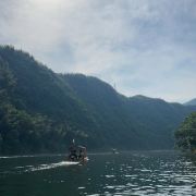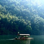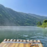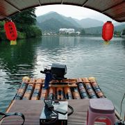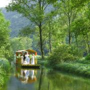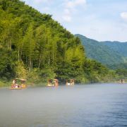 西津野渡竹筏生态观光景区堪比游览桂林漓江山水,令人留念往返。它位于皖南川藏线宁国入口段,距宁国市区10公里,青龙湾大坝下游2公里,是此旅游线路的核心景区之一,也是必经网红打卡点。河道观光全程约5公里,行程约1小时,沿途河流蜿蜒曲折,两岸青山环绕,竹筏前行,感觉穿梭在万亩竹海中;沿河两岸民居错落有致;河水清澈鱼翔浅底;野鸭四处游荡,白鹭水面争鸣;若恰逢水面烟雾浩渺,竹筏缓行,蒙胧之中,胜似仙境!
