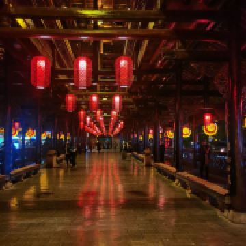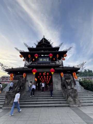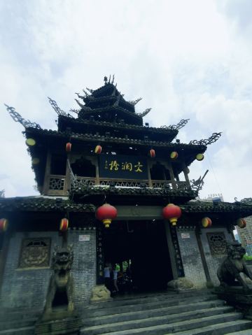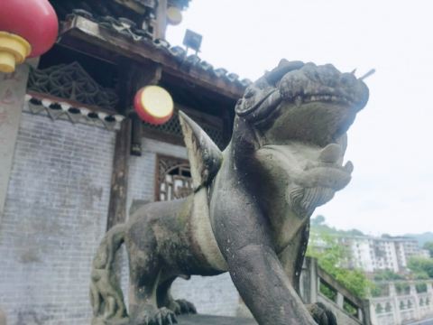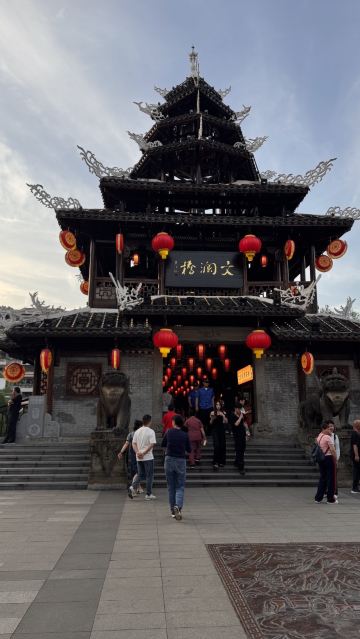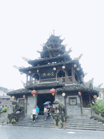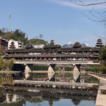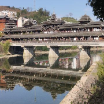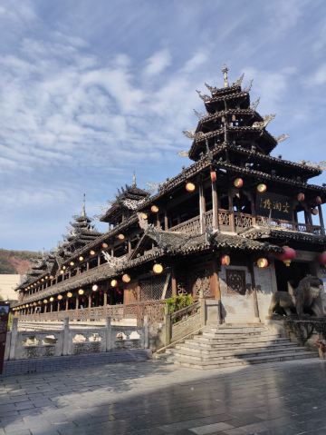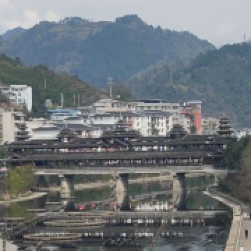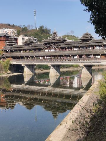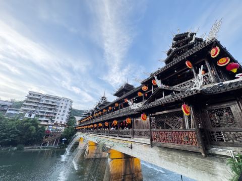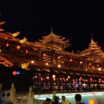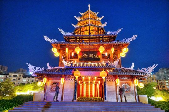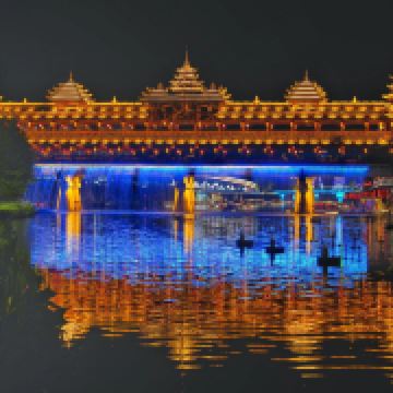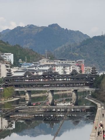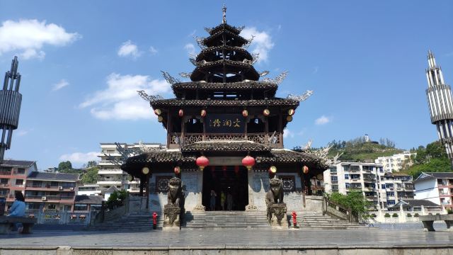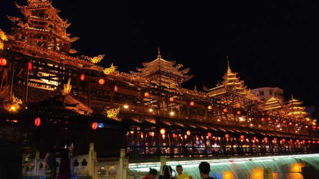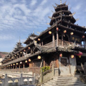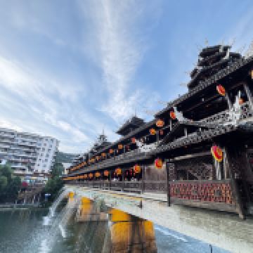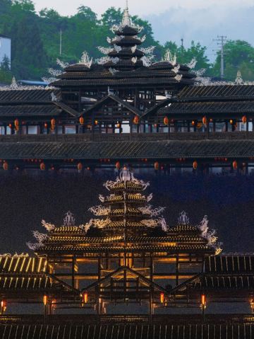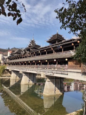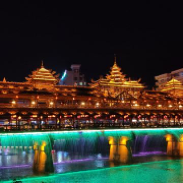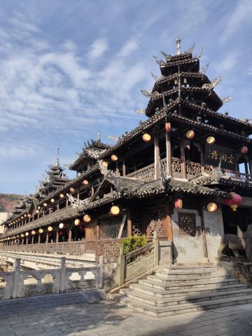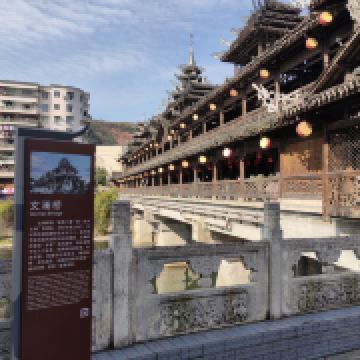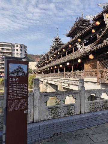 文澜桥,坐落于湖北恩施土家族苗族自治州宣恩县的贡水河上,是一座极具特色的仿古风雨桥。文澜桥全长 80 米,宽 10 米,高约 26 米,五礅四跨,桥下部为钢混结构,上部为全木质结构。其采用侗族花桥和鼓楼及土家族凉亭桥相结合的建筑风格,22 架木排运用中国南方特有的穿斗式组合结构,榫铆衔接的梁柱体系,亭檐上下均为飞角斗拱,屋脊瓦沿设有古朴装饰,尽显民族建筑之美。桥头南北两面的砖石结构门楼外,分别立有座式麒麟和走式独角兽各一对,寓意 “风调雨顺”。