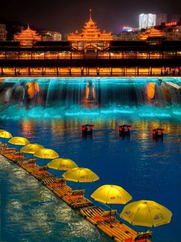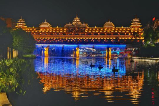 文澜桥不仅是交通要道,更是文化的象征。它见证了宣恩的历史变迁,承载着当地丰富的民族文化内涵。白天,桥身与贡水河两岸的风光相互映衬,优雅大气;夜晚,霓虹灯亮起,灯光倒映在河水中,宛如梦幻画卷,与周边的音乐喷泉、贡水夜景等共同构成了宣恩独特的城市景观。