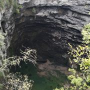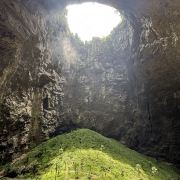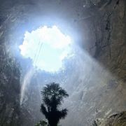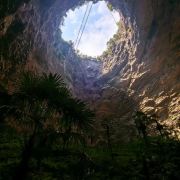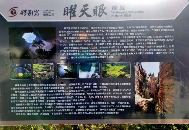 矅天眼天坑是目前世界已发现的天坑中少有的珍品。矅天眼景区深达290米,上口面积约10670平方米,底部面积约58030平方米。雨过天晴从洞口射入的阳光与坑内20多条从天而降的瀑布交相辉映,形成多条绚丽耀眼的彩虹,蔚为壮观。矅天眼景区内花草芬芳,藤蔓、苔藓、棕树、七叶一枝花等数十种植物交错生长;白头蝰、蛇、石蛙,蜗牛等多类物种繁衍生息。独特地貌和适宜气候造就了独有的生态系统,使之成为一处宁静和谐的“动植物王国”。