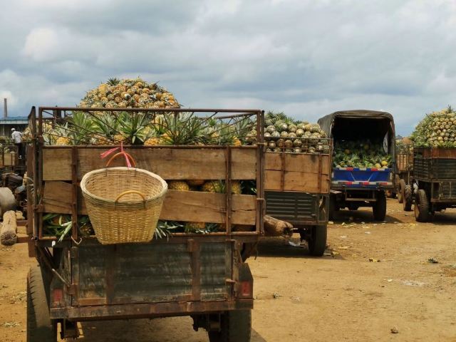 🍍来到这之前,想起“菠萝”两字,已经是垂涎欲滴,第一站就到了“中国菠萝第一村—愚公楼村”,村的马路边,就有一溜儿摆摊卖菠萝,不论大小,不论菠萝还是凤梨品种,一律2元一斤。这个村种植的菠萝果大、汁多、味甜、内脆
