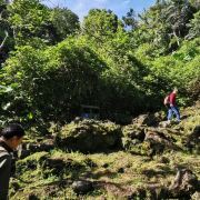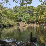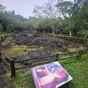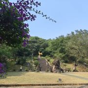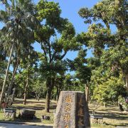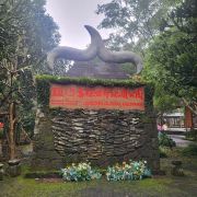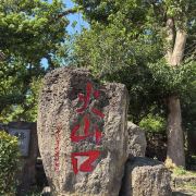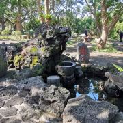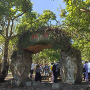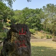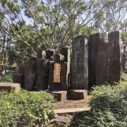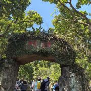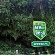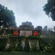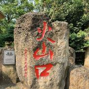 步道尽头是火山神庙,立有“山岳配天”横碑和刻着“大王神”、“土地神”和“应铸神”的石碑。坡地往上有199层台阶,99代表九九重阳,100意味着走完这个火山口能长命百岁。