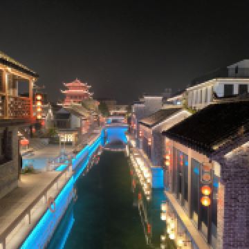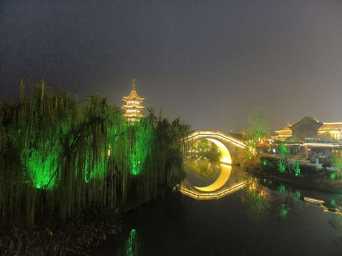 3. 水巷流光:河道里,游船缓缓划过,船舷两侧泛起金色的涟漪。河面上倒映着两岸的灯火,波光粼粼,宛如一幅流动的画卷。远处,几座古亭在灯光的笼罩下,静静伫立,与水中的倒影相映成趣,构成了一幅绝美的水乡夜景图。
