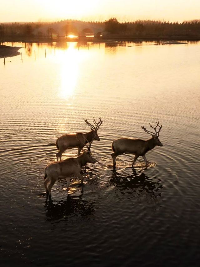 建议自驾前往,沿着网红启明路行驶,两侧湿地与树林交织成天然氧吧,可能偶遇过马路的野生麋鹿,它们或在草地上觅食,或在浅滩戏水,胆子大的雄鹿还会展现顶角相争的野性画面,用长焦相机能拍出极具氛围感的大片。