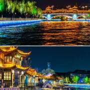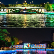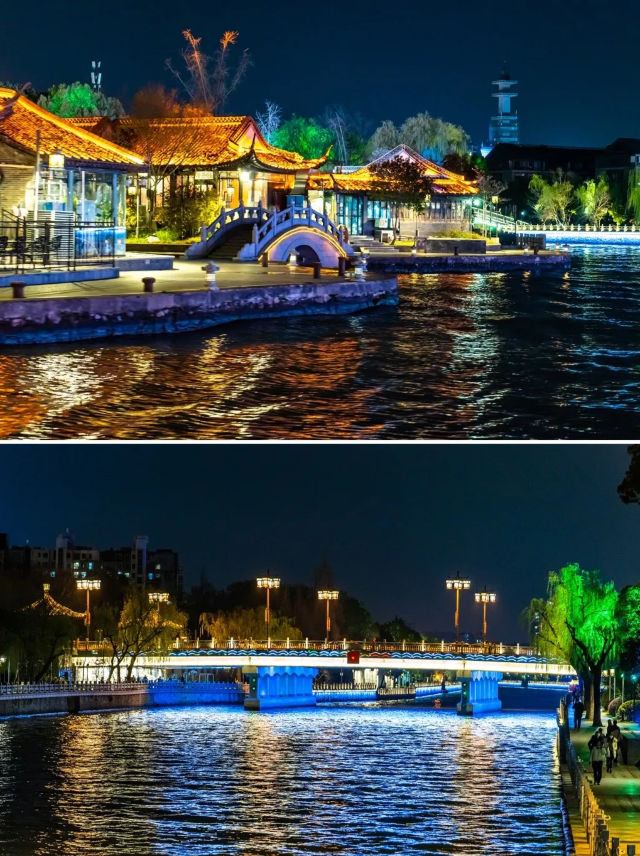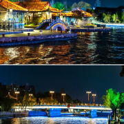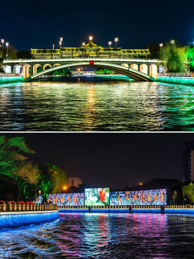 夜晚,运河两岸灯火辉煌,乘船游览,可欣赏到沿岸的亭台楼阁、古桥水榭。河水悠悠流淌,仿佛诉说着扬州的千年故事,是领略扬州历史文化和自然风光的绝佳去处。
