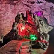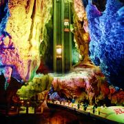 从棕榈大厅往下走,就是地下有轨电车站,乘上小电车,穿入一条长长的地下峡谷,峡谷高大而深邃,上下峭壁悬垂,危岩若坠,电车到站后,再走上洞中旱路返回。