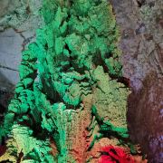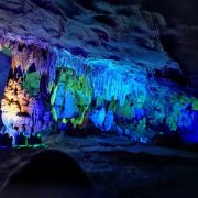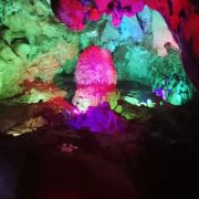 冠岩一共分为3层,上面两层为旱洞,洞内悬挂着各形各态的石钟乳,气势恢弘。和大部分的溶洞一样,它也有声光系统,洞中林立的石笋,在彩灯的照耀下,显得色彩斑斓,宛若仙境。上层到中层的电梯叫青云梯,高36米,是个观光电梯。下一层是地下暗河,长约700余米,河水清冽,哗然有声。