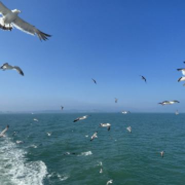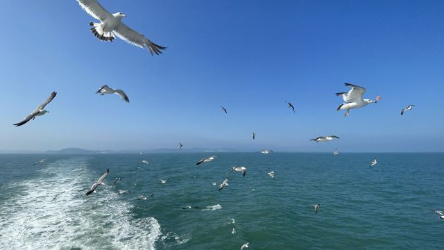 2️⃣船上可以喂海鸥,成群的海鸥会一直追随着船只。火腿肠掰成小块儿,往上空扔,一叼一准儿。