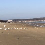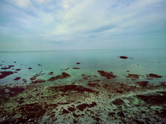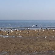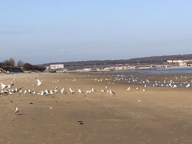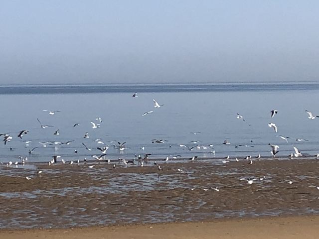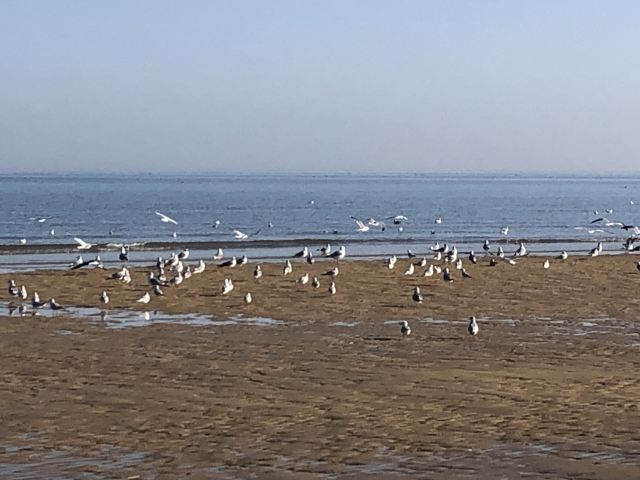 开车进入里蹦岛的尽头,便是细沙的海滩,今天的海滩到处都是蛏子,据说是昨天被大风潮了上来,因此海鸥占据了这里,它们在此享受蛏子的美味。