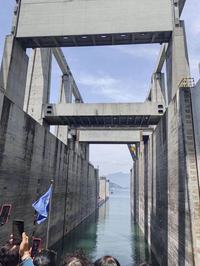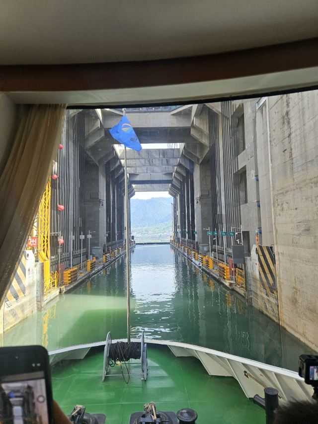 长江三峡5号离开承船厢驶入大坝上游,只见眼前“截断巫山云雨,高峡出平湖”的景色所震撼,不禁为国人利用自然、改造自然的智慧所折服。
