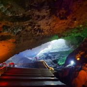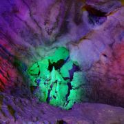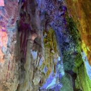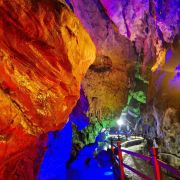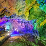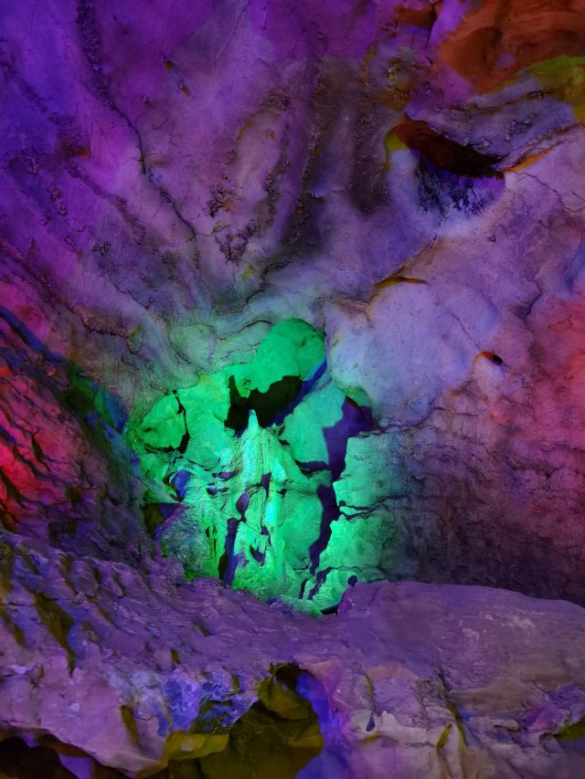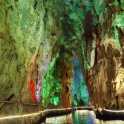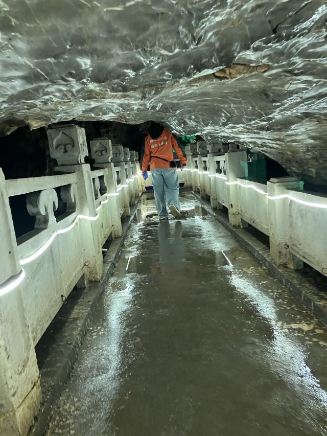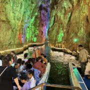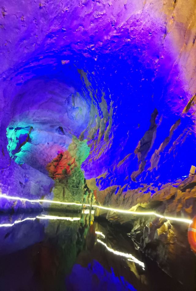 溶洞曲径幽深,有五颜六色的石钟乳、石笋,还有石龟探海、水帘洞府、龙宫海花、石瀑飞流等景观。