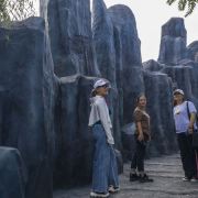 沿着景区的小路前行,我看到了一片模拟的冰川地貌。白色的冰川模型在阳光下闪烁着光芒,仿佛真的置身于寒冷的冰河时代。我小心翼翼地在冰川模型上行走,感受着远古时期的寒冷与神秘。