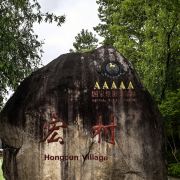 宏村景区位于黟县东北11公里,黄山市西北68公里处,始建于南宋绍兴年间(公元1131年-1162年),从明永乐年间(公元1403年-1424年)开始,逐步发展成了神奇的“牛形村”的样子。村口的古树是“牛角”,村中房屋鳞次栉比的明清徽派建筑是“牛身”,村西溪水上四座桥是“牛腿”,宏村景区-月沼是“牛胃”,南湖是“牛肚”,流经家家户户的水圳(导引清泉的水沟)则是“牛肠”。