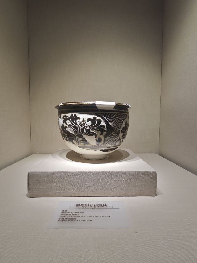 博物馆的二楼是“宁夏通史展厅”,也是博物馆重点游览的区域。西汉错金银铜羊、唐代胡旋舞石门扇、西夏鎏金铜牛、人像碑座、凸钉玻璃碗等镇馆之宝都位于二楼。此外游客还可以在这里看到“凉州重修护国寺感通塔碑铭”的拓片,拓片上的西夏文比汉字更像方块字。