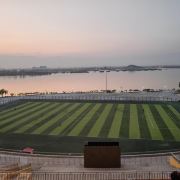 公园里有湖水域,面积颇大,波光粼粼。湖畔是一个标准的足球场。足球场边。三面环绕着高大的看台