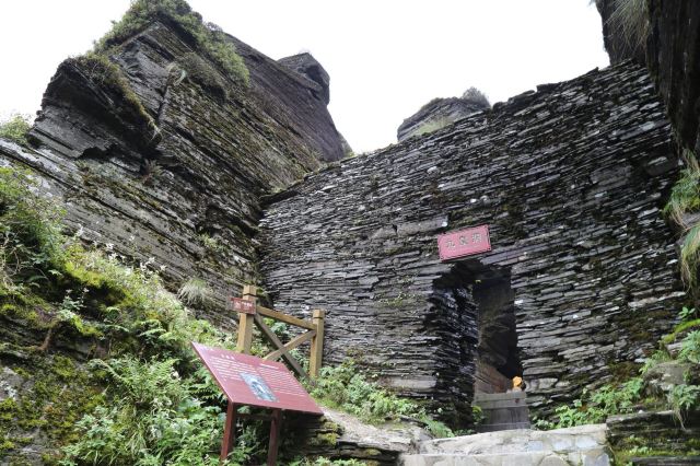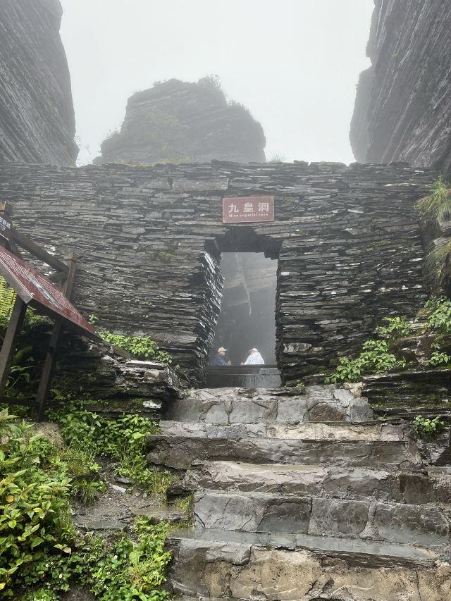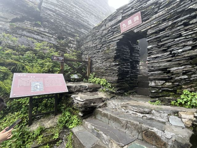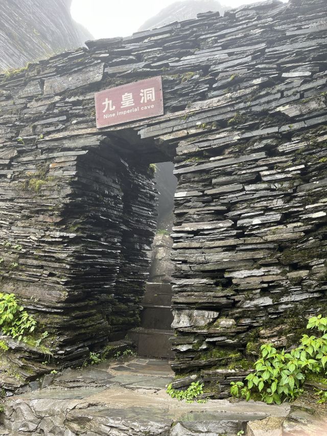 九皇洞位于梵净老山之下,洞口石墙依石壁而建,九皇洞由石门入门,见得一方整齐的天井,尔后深入洞内。扉崖的石墙上,刻有“洞天福地”四个大字,笔锋隽秀。据说这里是明朝万历皇帝的李皇娘修行的地方。