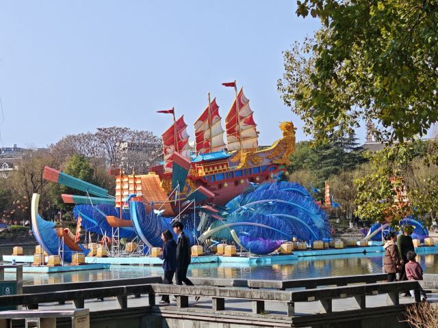 4分 满意绣湖公园是仿照明清时代的风格以烘托建于宋代的大安寺塔,中间是一个人工湖,湖水呈现绿色,有落叶点缀,周围绿树成荫,老人下棋和打牌,在这贸易纵横的义乌增添了一处小息之地。