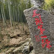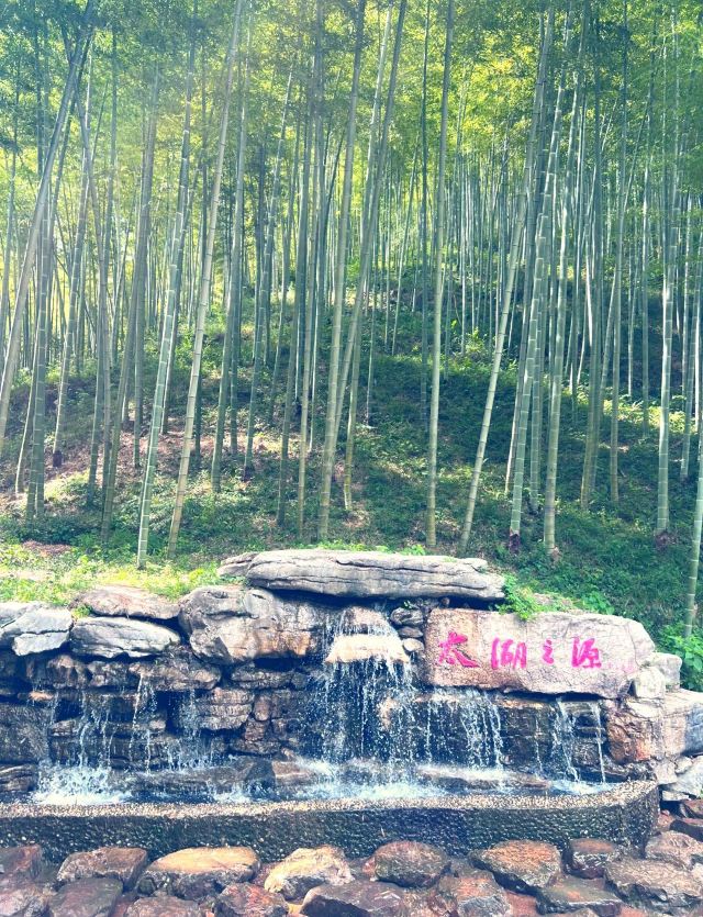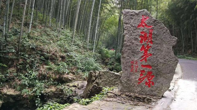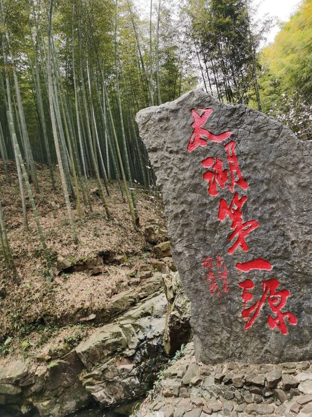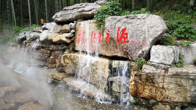 下山的路越是靠近山脚,伴随在路边的溪水越是大。当你下到山脚“海底”处,可以看到边上有块石头上刻着“太湖之源”,石下一潭池水,非常清澈。山上的泉水汇入太湖,所以得名“太湖之源”。
