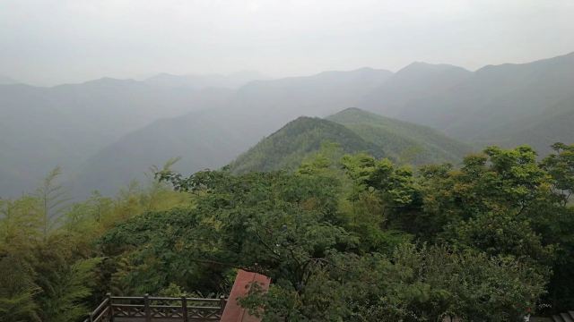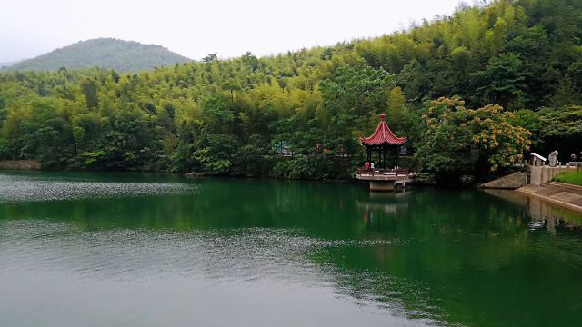 在缆车上可以从高空俯看竹海,有一种武侠片里大侠施展轻功用脚尖在竹林上飞驰的感觉。下缆车后,需再爬一小段路到山顶,在山顶的凌云阁可登高观景。站在这里,俯看满山遍野的竹林,山风吹过,摇摆的竹林像大海起伏的波浪,镜湖如同一块翡翠镶嵌其中。有趣的是,往北看是江苏宜兴地界,往西看是安徽宣城地界,往南看是浙江湖州地界。