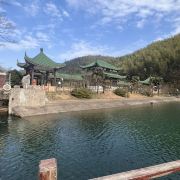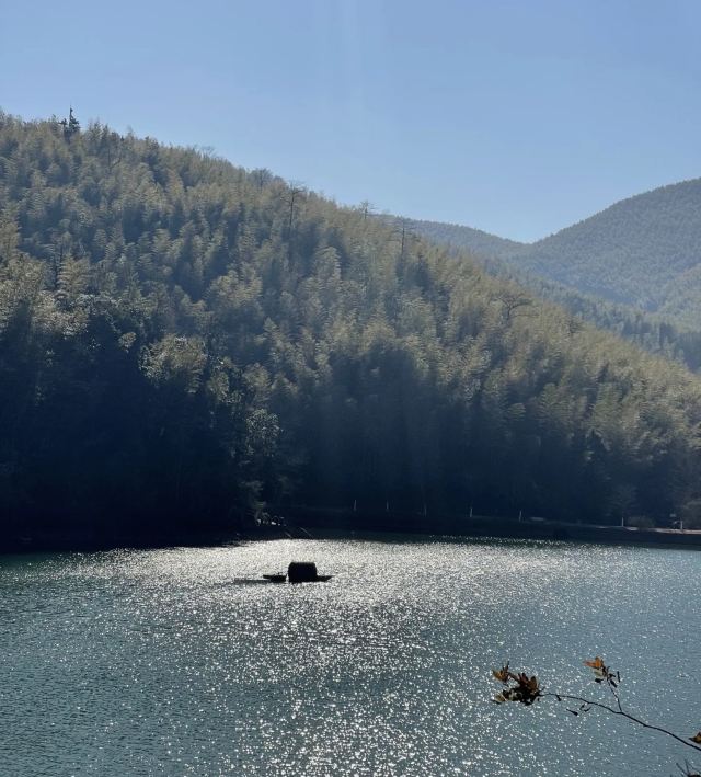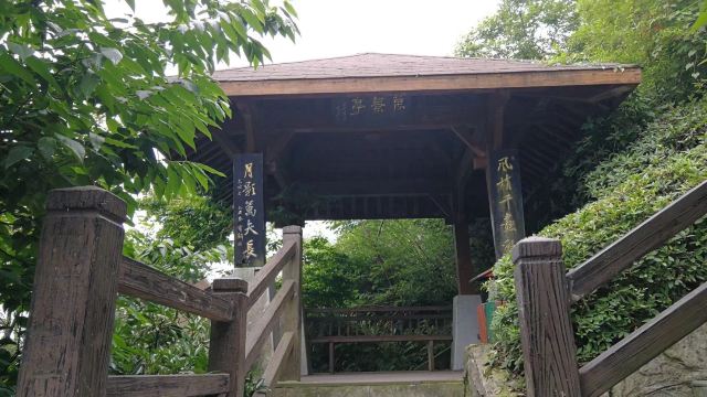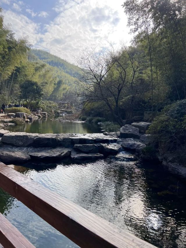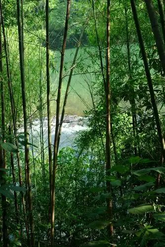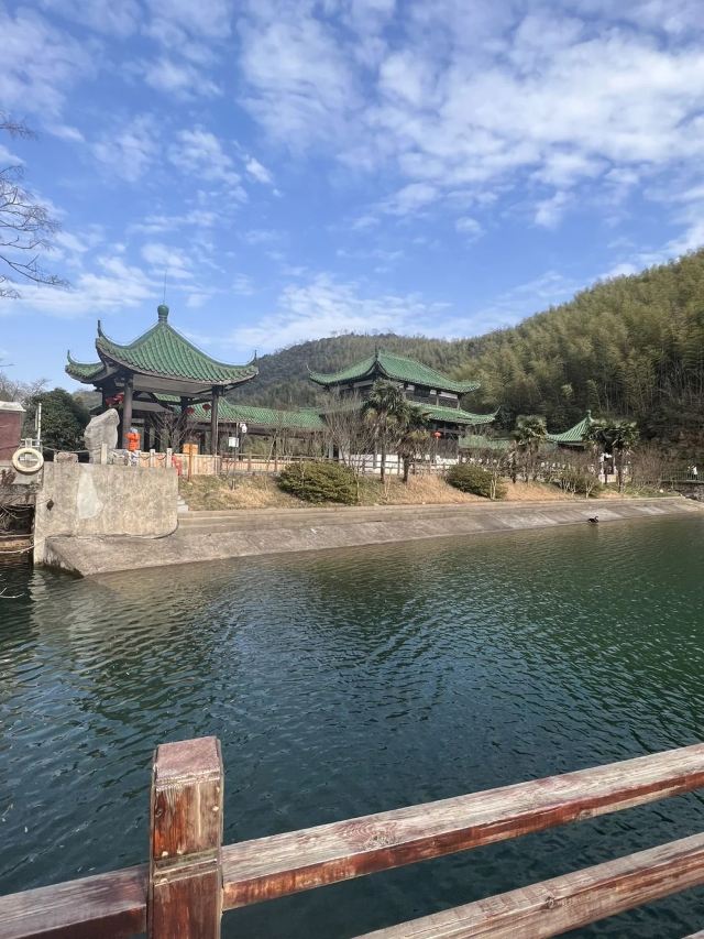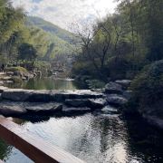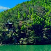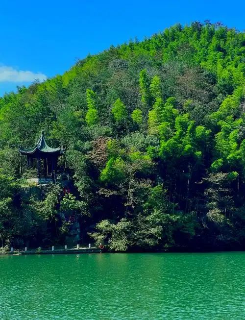 景区只有一扇大门,进入后,顺小道前行,先看到的景点是镜湖。镜湖湖面倒映着四周的绿竹和青山,湖中生活着有“活化石”之称的桃花水母,在湖东有看水母的水母亭。湖西有晃晃悠悠的索桥、寂照禅寺、千年古银杏等景点。