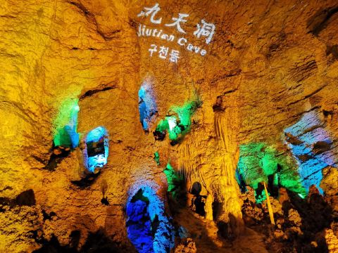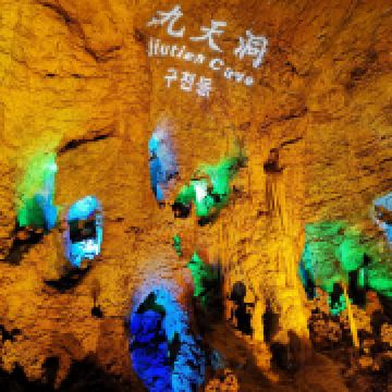 九天洞位于秀丽的鲁山南麓,发育于地持年代上的古生代奥陶纪石灰岩岩层中,该石灰岩系海(相)中沉积岩层,其生成年代距今为4.4-5.0亿年,九天洞的形成却只有一百万年左右的历史。九天洞洞腔长518米,高5-18米,游程往返约1.2公里,洞体结构十分稳定,洞内化学堆积类型十分丰富,多达37种;其中稀有类型有7种,大面积的球状和针状结晶体、月奶石、石花、石莲被誉为“九天四绝”,是全国稀有景观类型多的溶洞,同时又是石花面积大的溶洞,具有重要的科学和观赏价值。此洞之所以称为“九天”,是因为神话传说中天有九层,即九天,而这个洞也有九个大的洞厅,景观可与神话中的天宫相妣美,所以叫九天洞。这九个厅分别是:天地之间厅、步天厅、天河厅、天宫厅、天街厅、天国花园厅、巡天厅、梦幻天堂厅、别有洞天厅。2001年初中国的洞穴科学家、中国洞穴研究会会长朱学稳教授为首的设计组对九天洞进行了全面的科学调查、鉴定与设计,并完成了灯光改造工程,其科学化与现代化设计均居全国游览洞穴的先进水平。