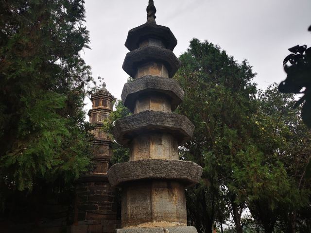 郭塔建于清代康熙年间,据史籍记载:“清代康熙年间沛县僧人郭自高来芒砀山重修夫子庙继为主持,死后归葬于塔”。塔身共六级浮屠由64块砖雕镶嵌而成。砖上雕刻的有花卉、西游记神话人物(孙悟空、猪八戒、唐僧等)东侧的石塔上刻有“清康熙四十八年”(1709年)等字样。